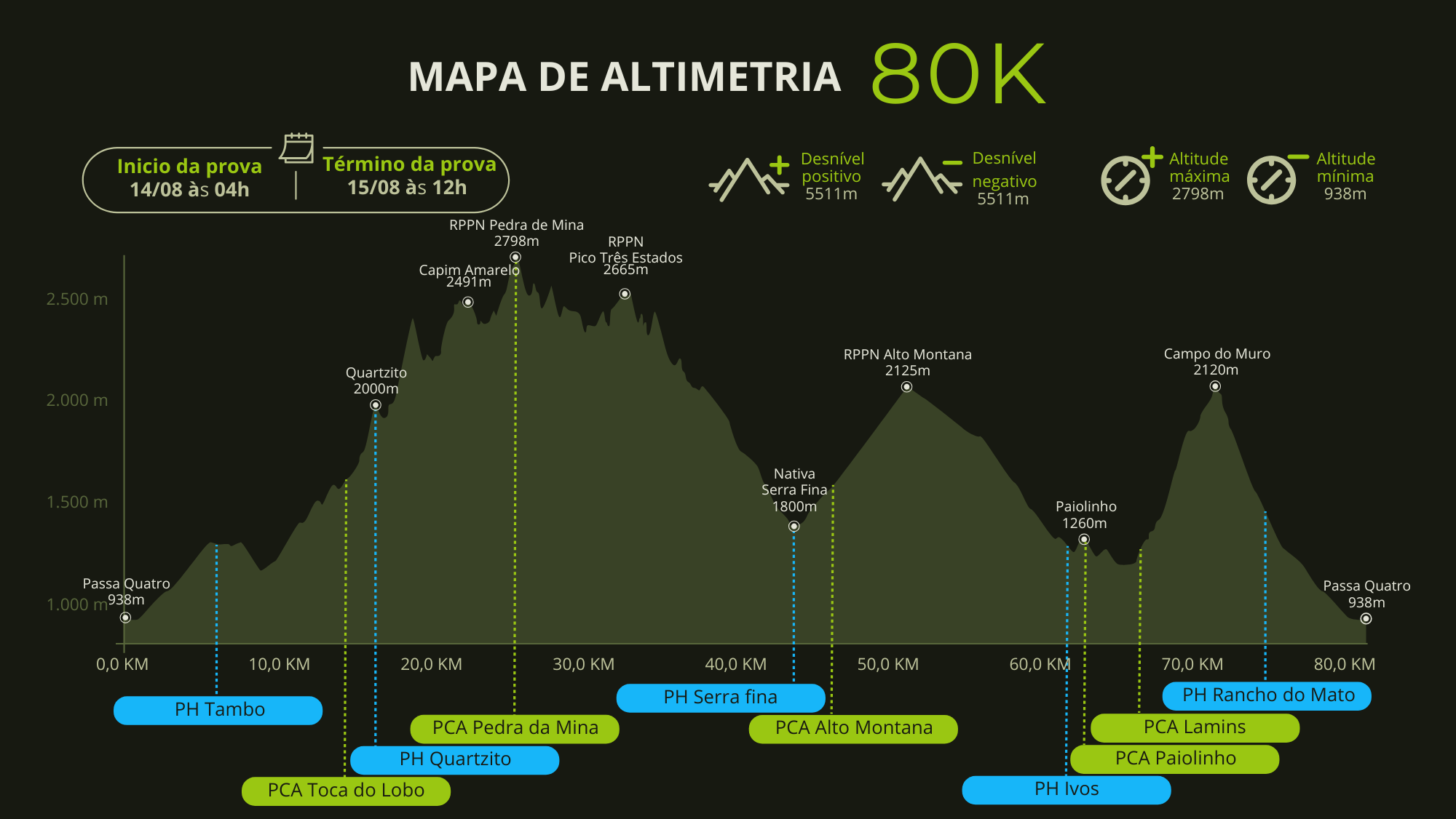 A La Mision Brasil 80km tem início na cidade de Passa Quatro e percorre toda a travessia da Serra Fina, considerada por muitos como uma das mais difíceis do Brasil, atingindo os cumes: Capim Amarelo, Pedra da Mina e Três Estados.